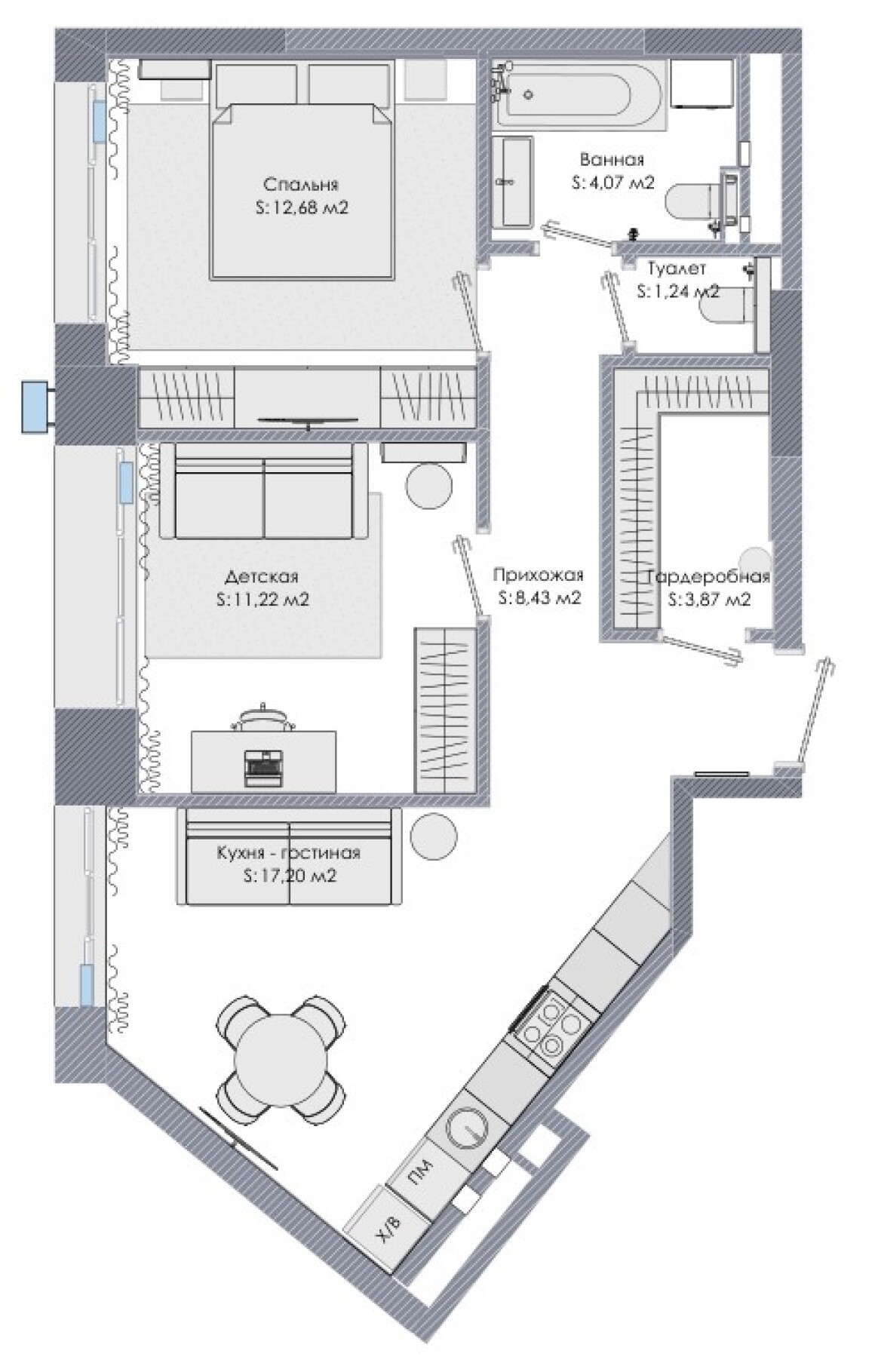 В квартире неправильной формы кухня, совмещенная с гостиной, несмотря на большую площадь, получилась большая рабочая поверхность около 5 м, что позволило обойтись без верхних шкафов, кроме шкафа для вытяжки
